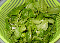 There are a couple of different methods to use when dealing with basil, but since I'm all about the easiest and least time intensive, I chose the freezer method. I rinsed the basil in a sink full of cold water and 2 teaspoons of salt (again, to get rid of the critters), plucked the leaves from the stems and used a salad spinner to get rid of the excess water. I made one interesting discovery during this process - my daughter Amanda's dog Sophie (who is living with us while Amanda is in the Army) is not a big fan of the salad spinner. In fact, once I started spinning away, she promptly ran upstairs and hid under the bed and wouldn't come down until I had put the salad spinner back in the cupboard.
